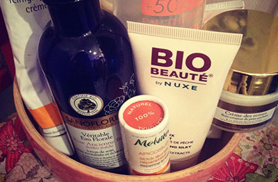 Soin gommant visage Melvita ou crème purifiante Dr Hauschka (une à trois fois par semaine) + eau de rose + crème Yves Rocher peaux sèches (vue ici) ou crème lait d’ânesse Sobio (voir plus bas).